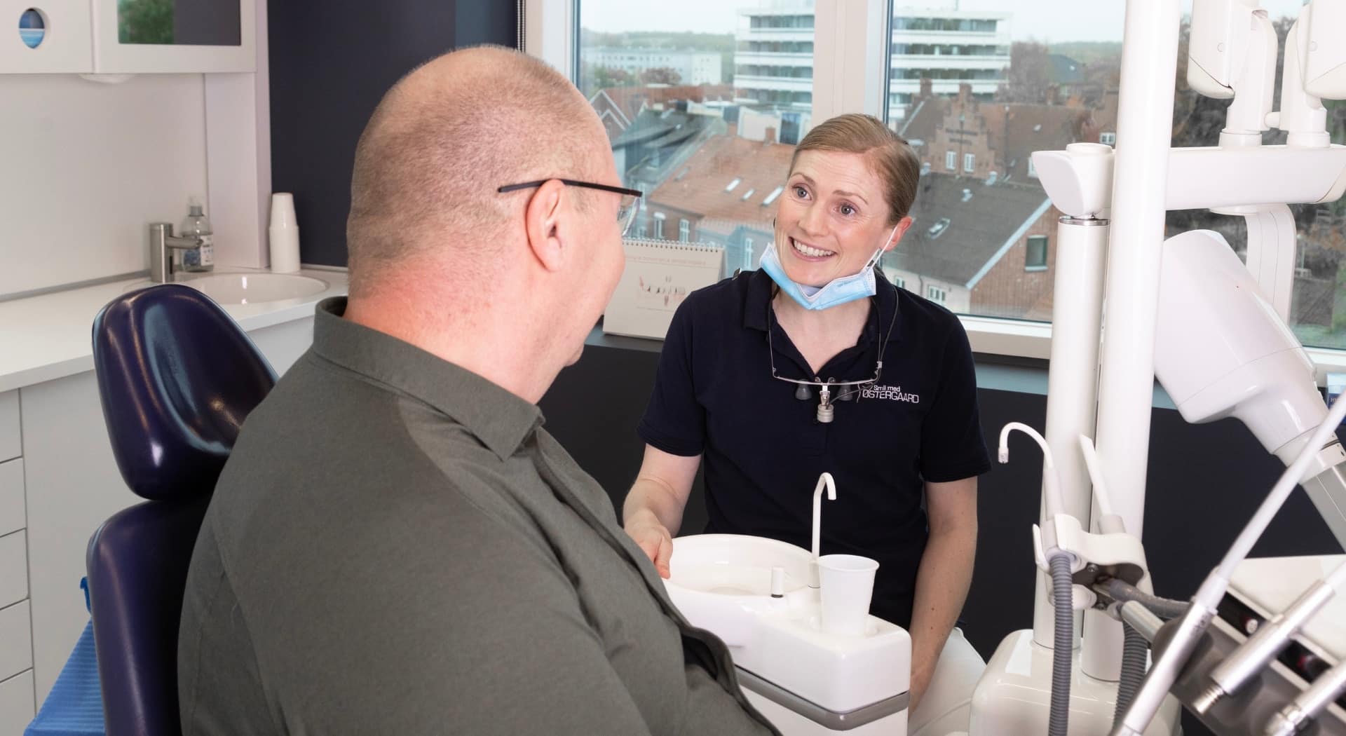 Vores klinik i Skive er bekvemt placeret i midtbyen og tilbyder gode parkeringsmuligheder, så du nemt kan komme til din tandlægeaftale. Mens du venter på din tid hos tandlægen eller tandplejeren, kan du slappe af i vores store, lækre loungeområde. Nyd en kop kaffe, kakao, te eller vand og lad dig forkæle, inden du går ind til din behandling.